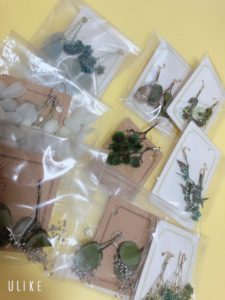 ピアスやイヤリングも本物のプリザーブドフラワーを使って作りましたので